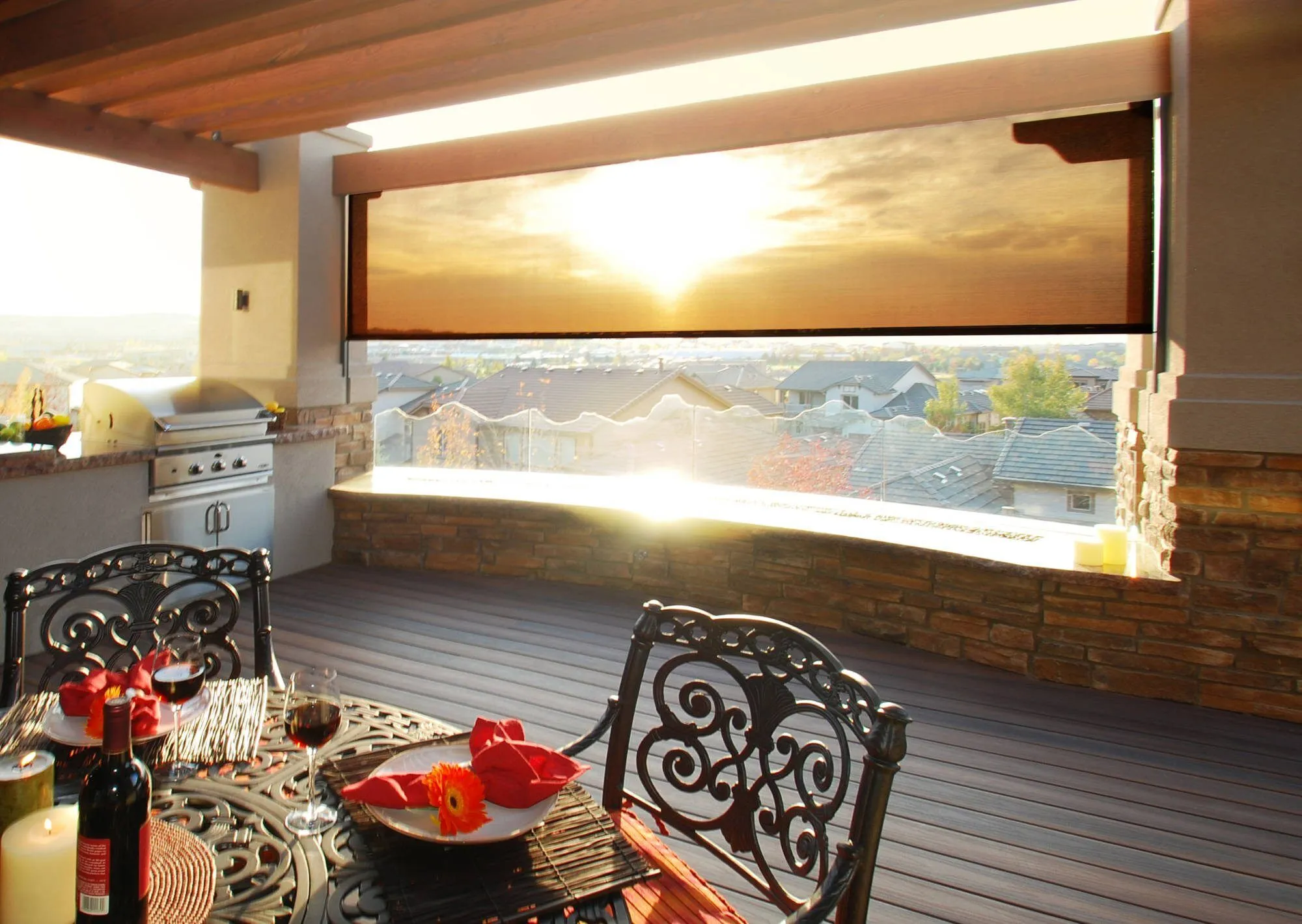 Motorized control is particularly practical for larger patio openings where a manual shade would be heavy and awkward to operate. It also means adjustments happen quickly. When a cloud passes and the sun comes back, the shade drops into place in seconds.